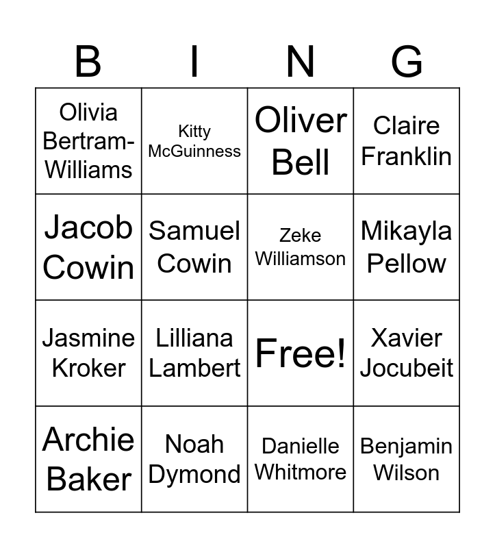 This bingo card has 19 words: Free!, Angus Baker, Oliver Bell, Benjamin Wilson, Xavier Jocubeit, Jacob Cowin, Danielle Whitmore, Olivia Bertram-Williams, Kitty McGuinness, Jasmine Kroker, Lilliana Lambert, Samuel Cowin, Zeke Williamson, Noah Dymond, Archie Baker, Grace Bjelke-Petersen, Claire Franklin, Mikayla Pellow and Lara Kotzur.