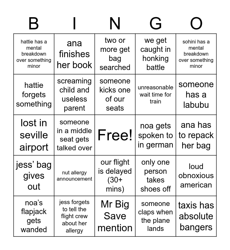 This bingo card has a free space and 24 words: nut allergy announcement, jess forgets to tell the flight crew about her allergy, someone kicks one of our seats, noa’s flapjack gets wanded, sohini has a mental breakdown over something minor, hattie has a mental breakdown over something minor, hattie forgets something, ana finishes her book, noa gets spoken to in german, our flight is delayed (30+ mins), unreasonable wait time for train, lost in seville airport, only one person takes shoes off, loud obnoxious american, screaming child and useless parent, someone claps when the plane lands, ana has to repack her bag, two or more get bag searched, someone has a labubu, someone in a middle seat gets talked over, taxis has absolute bangers, jess’ bag gives out, we get caught in honking battle and Mr Big Save mention.