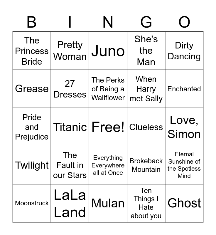 This bingo card has a free space and 24 words: The Fault in our Stars, LaLa Land, The Perks of Being a Wallflower, Moonstruck, Dirty Dancing, The Princess Bride, Grease, Pretty Woman, Clueless, Everything Everywhere all at Once, When Harry met Sally, Pride and Prejudice, Brokeback Mountain, Eternal Sunshine of the Spotless Mind, 27 Dresses, Ten Things I Hate about you, Love, Simon, Juno, Enchanted, Titanic, Ghost, Twilight, She's the Man and Mulan.