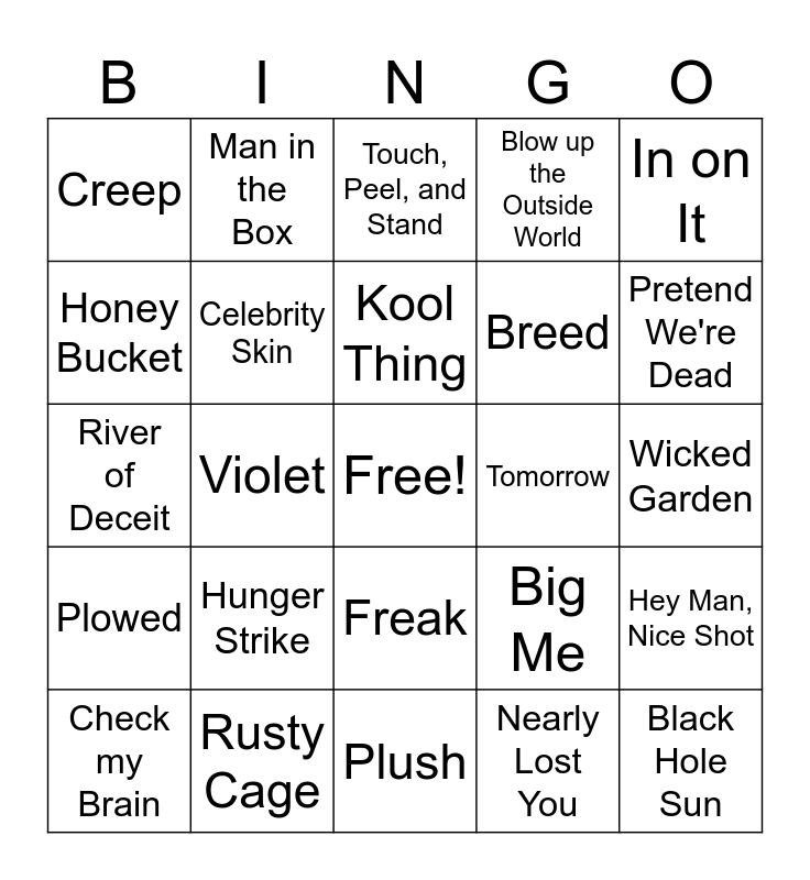 This bingo card has a free space and 50 words: Yellow Ledbetter, Black Hole Sun, Would?, Plush, Hunger Strike, Alive, Man in the Box, Nutshell, Honey Bucket, Cannonball, Celebrity Skin, Blow up the Outside World, Hey Man, Nice Shot, Big Me, Backwater, I Stay Away, Kool Thing, Tomorrow, Jessie, In on It, Violet, Nearly Lost You, Creep, Breed, Seether, Feel the Pain, Pretend We're Dead, Grease Box, Touch, Peel, and Stand, Freak, Pure Massacre, Israel's Son, Cherub Rock, No Excuses, Rusty Cage, Heaven Beside You, Zero, Outshined, Interstate Love Song, Wicked Garden, Serve the Servants, Stars, Just Breathe, My Hero, Check my Brain, River of Deceit, Cut You In, My Song, Plowed and Everlong.