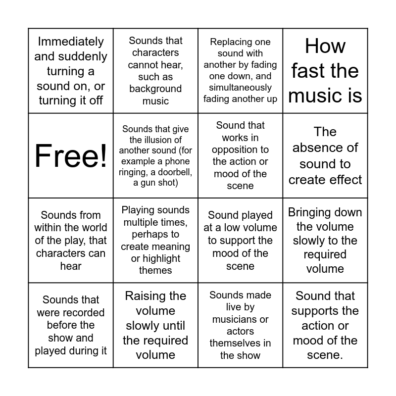 This bingo card has 16 words: Raising the volume slowly until the required volume, Bringing down the volume slowly to the required volume, Replacing one sound with another by fading one down, and simultaneously fading another up, Immediately and suddenly turning a sound on, or turning it off, Sounds from within the world of the play, that characters can hear, Sounds that characters cannot hear, such as background music, Sound played at a low volume to support the mood of the scene, Sounds made live by musicians or actors themselves in the show, Free!, Sounds that give the illusion of another sound (for example a phone ringing, a doorbell, a gun shot), Sounds that were recorded before the show and played during it, How fast the music is, Playing sounds multiple times, perhaps to create meaning or highlight themes, The absence of sound to create effect, Sound that works in opposition to the action or mood of the scene and Sound that supports the action or mood of the scene..
