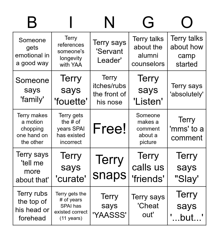 This bingo card has a free space and 24 words: Terry says 'curate', Terry gets the # of years SPAI has existed correct (11 years), Terry itches/rubs the front of his nose, Terry rubs the top of his head or forehead, Terry talks about how camp started, Someone gets emotional in a good way, Someone says 'family', Terry references someone's longevity with YAA, Someone makes a comment about a picture, Terry snaps, Terry says 'Listen', Terry makes a motion chopping one hand on the other, Terry calls us 'friends', Terry says "Slay', Terry says 'fouette', Terry says 'Cheat out', Terry 'mms' to a comment, Terry says 'Servant Leader', Terry says 'absolutely', Terry gets the # of years SPAI has existed incorrect, Terry says '...but...', Terry says 'tell me more about that', Terry talks about the alumni counselors and Terry says 'YAASSS'.