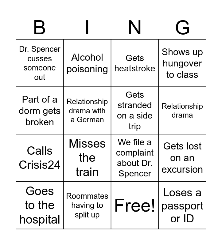 This bingo card has 17 words: Free!, Goes to the hospital, Gets heatstroke, Dr. Spencer cusses someone out, Misses the train, Shows up hungover to class, Gets lost on an excursion, Gets stranded on a side trip, Relationship drama, Relationship drama with a German, Roommates having to split up, We file a complaint about Dr. Spencer, Part of a dorm gets broken, Alcohol poisoning, Calls Crisis24, Calls 110 (police) and Loses a passport or ID.