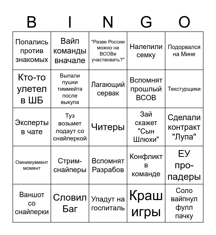 This bingo card has a free space and 24 words: Стрим- снайперы, Словил Баг, Лагающий сервак, Ваншот со снайперки, Подорвался на Мине, Попались против знакомых, Кто-то улетел в ШБ, Вайп команды вначале, Зай скажет "Сын Шлюхи", Вспомнят Разрабов, Вспомнят прошлый ВСОВ, Эксперты в чате, Конфликт в команде, ЕУ про-падеры, Выпали пушки тиммейта после выкупа, Краш игры, Сделали контракт "Лупа", "Разве России можно на ВСОВе участвовать?", Текстурщики, Туз возьмет лодаут со снайперкой, Соло вайпнул фулл пачку, Омнимувмент момент, Налепили семку and Упадут на госпиталь.