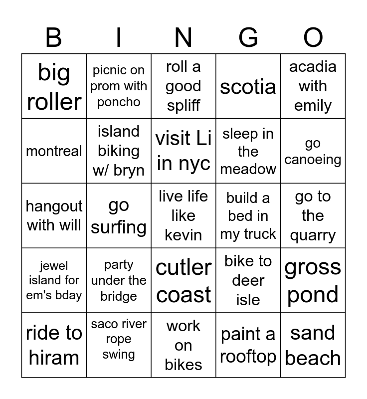 This bingo card has a free space and 24 words: party under the bridge, saco river rope swing, visit Li in nyc, ride to hiram, acadia with emily, big roller, montreal, picnic on prom with poncho, build a bed in my truck, cutler coast, sleep in the meadow, hangout with will, bike to deer isle, gross pond, island biking w/ bryn, paint a rooftop, go to the quarry, roll a good spliff, go canoeing, go surfing, sand beach, jewel island for em's bday, scotia and work on bikes.