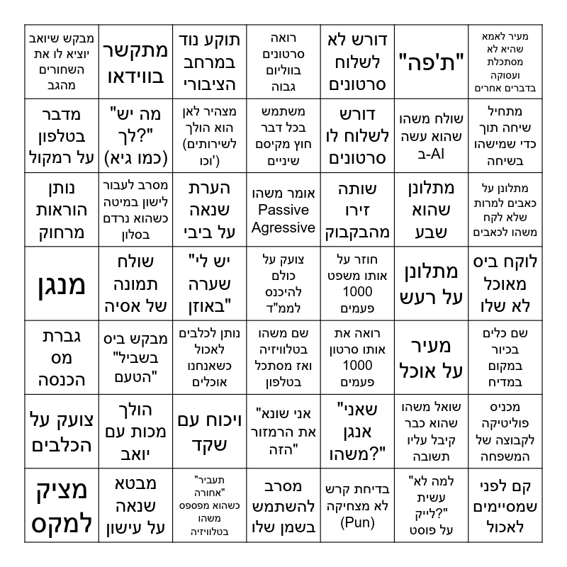 This bingo card has 49 words: שואל משהו שהוא כבר קיבל עליו תשובה, שולח משהו שהוא עשה ב-AI, בדיחת קרש לא מצחיקה (Pun), שולח תמונה של אסיה, הערת שנאה על ביבי, לוקח ביס מאוכל לא שלו, מתקשר בווידאו, "תעביר אחורה" כשהוא מפספס משהו בטלוויזיה, "ת'פה", שם משהו בטלוויזיה ואז מסתכל בטלפון, מעיר לאמא שהיא לא מסתכלת ועסוקה בדברים אחרים, רואה סרטונים בווליום גבוה, מתלונן שהוא שבע, שותה זירו מהבקבוק, הולך מכות עם יואב, מתלונן על רעש, מדבר בטלפון על רמקול, מתחיל שיחה תוך כדי שמישהו בשיחה, מכניס פוליטיקה לקבוצה של המשפחה, דורש לא לשלוח סרטונים, דורש לשלוח לו סרטונים, "יש לי שערה באוזן", מבקש שיואב יוציא לו את השחורים מהגב, "מה יש לך?" (כמו גיא), מציק למקס, מצהיר לאן הוא הולך (לשירותים וכו'), מתלונן על כאבים למרות שלא לקח משהו לכאבים, מבטא שנאה על עישון, אומר משהו Passive Agressive, מסרב לעבור לישון במיטה כשהוא נרדם בסלון, קם לפני שמסיימים לאכול, חוזר על אותו משפט 1000 פעמים, צועק על הכלבים, ויכוח עם שקד, מנגן, רואה את אותו סרטון 1000 פעמים, מעיר על אוכל, שם כלים בכיור במקום במדיח, נותן הוראות מרחוק, נותן לכלבים לאכול כשאנחנו אוכלים, "אני שונא את הרמזור הזה", גברת מס הכנסה, צועק על כולם להיכנס לממ"ד, מסרב להשתמש בשמן שלו, משתמש בכל דבר חוץ מקיסם שיניים, תוקע נוד במרחב הציבורי, "שאני אנגן משהו?", מבקש ביס "בשביל הטעם" and "למה לא עשית לייק?" על פוסט.