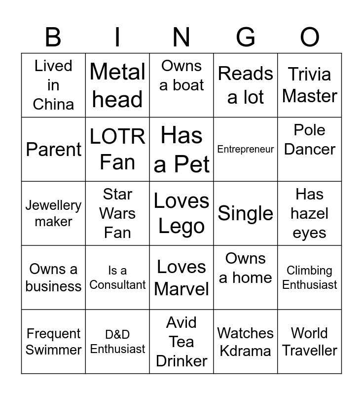 This bingo card has 36 words: Good dancer, Owns SUP boards, Physicist, LOTR Fan, Owns a home, Owns a business, Has a Pet, Pilates Enthusiast, Trivia Master, Been on TV, Star Wars Fan, Reads a lot, Harry Potter Fan, Single, Pole Dancer, Lived in China, World Traveller, Is a Consultant, Loves Lego, Owns a boat, Has hazel eyes, Climbing Enthusiast, D&D Enthusiast, Frequent Swimmer, Avid Tea Drinker, Metal head, Jewellery maker, Lawyer, Entrepreneur, Parent, Speaks Spanish, Watches Anime, Watches Kdrama, Loves Marvel, Loves Boardgames and Investor.