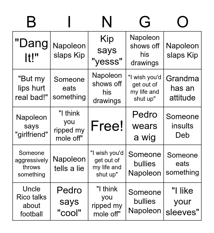 This bingo card has a free space and 73 words: "Dang It!", Napoleon talks with his eyes closed, Kip says "yesss", Uncle Rico & Napoleon fight, Tater tots are mentioned, Pedro says "cool", Napoleon tells a lie, Kip talks to himself, Someone bullies Napoleon, "But my lips hurt real bad!", Uncle Rico talks about football, Someone dramatically sighs, Pedro wears a wig, Someone insults Deb, Grandma has an attitude, Napoleon slaps Kip, Rex punches his palm, "I wish you'd get out of my life and shut up", Kip says "geez", Napoleon says "girlfriend", Someone eats something, "I think you ripped my mole off", Napoleon shows off his drawings, "I like your sleeves", Someone aggressively throws something, "Dang It!", Napoleon talks with his eyes closed, Kip says "yesss", Uncle Rico & Napoleon fight, Tater tots are mentioned, Pedro says "cool", Napoleon tells a lie, Kip talks to himself, Someone bullies Napoleon, "But my lips hurt real bad!", Uncle Rico talks about football, Someone dramatically sighs, Someone insults Deb, Grandma has an attitude, Napoleon slaps Kip, Rex punches his palm, "I wish you'd get out of my life and shut up", Kip says "geez", Napoleon says "girlfriend", Someone eats something, "I think you ripped my mole off", Napoleon shows off his drawings, "I like your sleeves", Someone aggressively throws something, "Dang It!", Napoleon talks with his eyes closed, Kip says "yesss", Uncle Rico & Napoleon fight, Tater tots are mentioned, Pedro says "cool", Napoleon tells a lie, Kip talks to himself, Someone bullies Napoleon, "But my lips hurt real bad!", Uncle Rico talks about football, Someone dramatically sighs, Someone insults Deb, Grandma has an attitude, Napoleon slaps Kip, Rex punches his palm, "I wish you'd get out of my life and shut up", Kip says "geez", Napoleon says "girlfriend", Someone eats something, "I think you ripped my mole off", Napoleon shows off his drawings, "I like your sleeves" and Someone aggressively throws something.