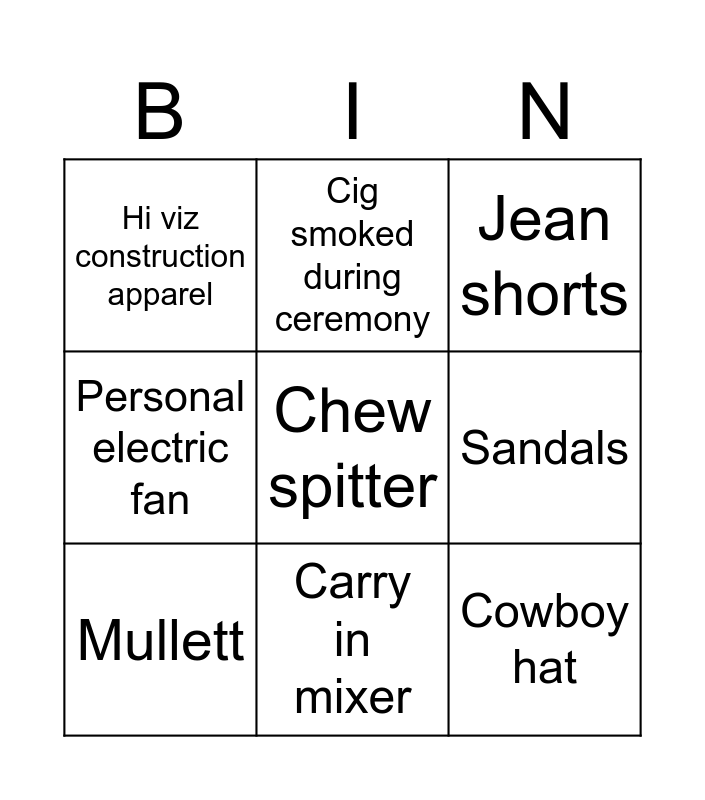 This bingo card has 9 words: Mullett, Jean shorts, Cig smoked during ceremony, Personal electric fan, Hi viz construction apparel, Sandals, Chew spitter, Cowboy hat and Carry in mixer.
