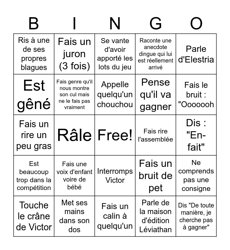 This bingo card has a free space and 24 words: Fais une voix d'enfant voire de bébé, Met ses mains dans son dos, Appelle quelqu'un chouchou, Touche le crâne de Victor, Parle d'Elestria, Ris à une de ses propres blagues, Est gêné, Fais un juron (3 fois), Fais rire l'assemblée, Interromps Victor, Pense qu'il va gagner, Fais un rire un peu gras, Fais un bruit de pet, Ne comprends pas une consigne, Fais genre qu'il nous montre son cul mais ne le fais pas vraiment, Parle de la maison d'édition Léviathan, Dis : "En-fait", Se vante d'avoir apporté les lots du jeu, Fais le bruit : "Ooooooh, Râle, Dis "De toute manière, je cherche pas à gagner", Est beaucoup trop dans la compétition, Raconte une anecdote dingue qui lui est réellement arrivé and Fais un calin à quelqu'un.