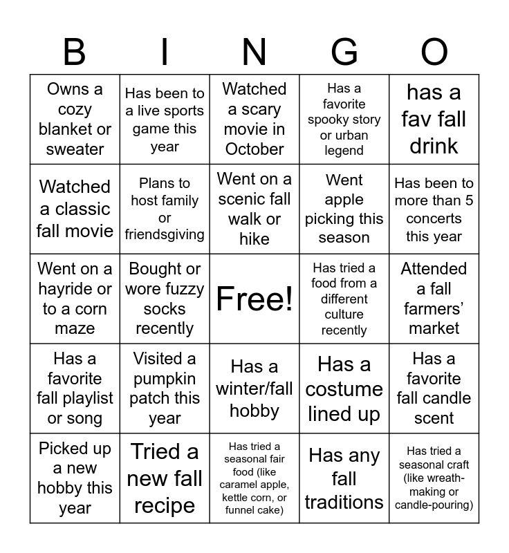 This bingo card has a free space and 24 words: Visited a pumpkin patch this year, Tried a new fall recipe, Went on a scenic fall walk or hike, Picked up a new hobby this year, has a fav fall drink, Owns a cozy blanket or sweater, Watched a classic fall movie, Has been to a live sports game this year, Has tried a food from a different culture recently, Has a winter/fall hobby, Went apple picking this season, Went on a hayride or to a corn maze, Has a costume lined up, Has a favorite fall candle scent, Plans to host family or friendsgiving, Has any fall traditions, Attended a fall farmers’ market, Watched a scary movie in October, Has been to more than 5 concerts this year, Bought or wore fuzzy socks recently, Has tried a seasonal craft (like wreath-making or candle-pouring), Has a favorite fall playlist or song, Has a favorite spooky story or urban legend and Has tried a seasonal fair food (like caramel apple, kettle corn, or funnel cake).