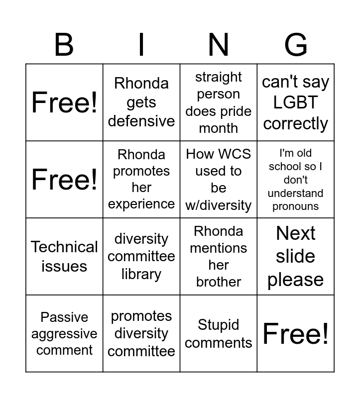 This bingo card has 16 words: promotes diversity committee, Next slide please, straight person does pride month, Free!, Technical issues, Rhonda gets defensive, Rhonda mentions her brother, Stupid comments, Free!, Rhonda promotes her experience, Passive aggressive comment, can't say LGBT correctly, diversity committee library, I'm old school so I don't understand pronouns, How WCS used to be w/diversity and Free!.