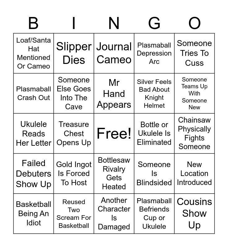 This bingo card has a free space and 24 words: Gold Ingot Is Forced To Host, Reused Two Scream For Basketball, Mr Hand Appears, Basketball Being An Idiot, Someone Tries To Cuss, Loaf/Santa Hat Mentioned Or Cameo, Plasmaball Crash Out, Slipper Dies, Bottle or Ukulele Is Eliminated, Bottlesaw Rivalry Gets Heated, Silver Feels Bad About Knight Helmet, Ukulele Reads Her Letter, Someone Is Blindsided, New Location Introduced, Someone Else Goes Into The Cave, Plasmaball Befriends Cup or Ukulele, Chainsaw Physically Fights Someone, Journal Cameo, Someone Teams Up With Someone New, Treasure Chest Opens Up, Cousins Show Up, Failed Debuters Show Up, Plasmaball Depression Arc and Another Character Is Damaged.