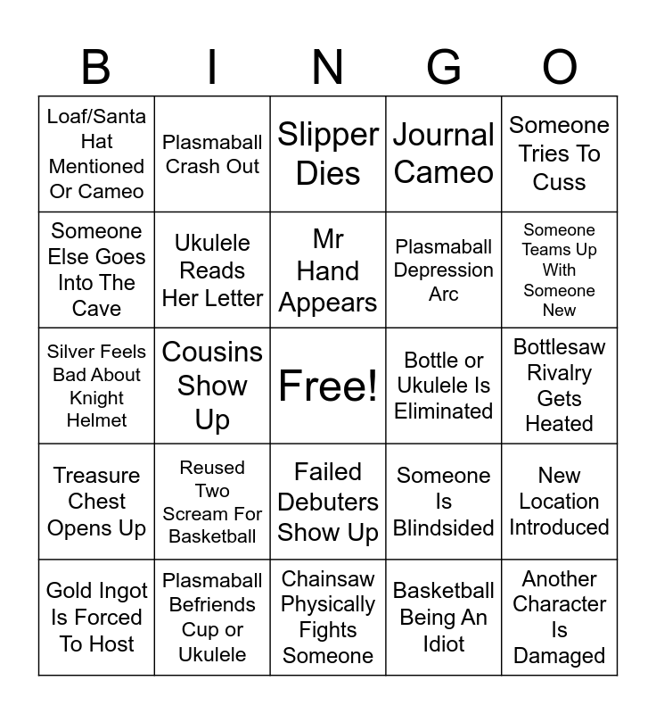 This bingo card has a free space and 24 words: Gold Ingot Is Forced To Host, Reused Two Scream For Basketball, Mr Hand Appears, Basketball Being An Idiot, Someone Tries To Cuss, Loaf/Santa Hat Mentioned Or Cameo, Plasmaball Crash Out, Slipper Dies, Bottle or Ukulele Is Eliminated, Bottlesaw Rivalry Gets Heated, Silver Feels Bad About Knight Helmet, Ukulele Reads Her Letter, Someone Is Blindsided, New Location Introduced, Someone Else Goes Into The Cave, Plasmaball Befriends Cup or Ukulele, Chainsaw Physically Fights Someone, Journal Cameo, Someone Teams Up With Someone New, Treasure Chest Opens Up, Cousins Show Up, Failed Debuters Show Up, Plasmaball Depression Arc and Another Character Is Damaged.