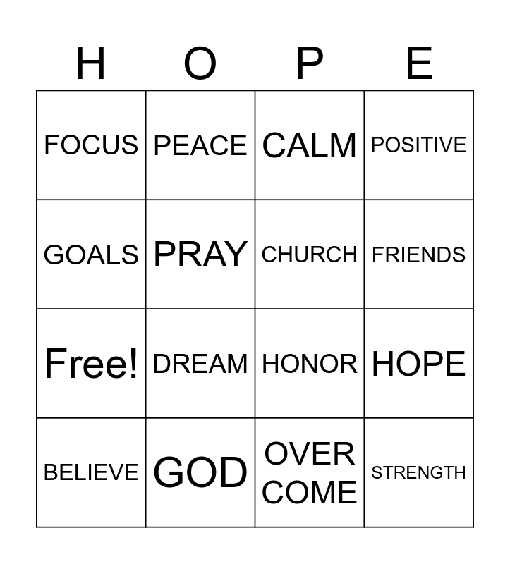 This bingo card has 20 words: HOPE, FAITH, CALM, LOVE, BELIEVE, GOALS, GOD, FOCUS, Free!, PEACE, DREAM, HONOR, PRAY, STRENGTH, CHURCH, FAMILY, FRIENDS, POSITIVE, OVER COME and FORGIVE.