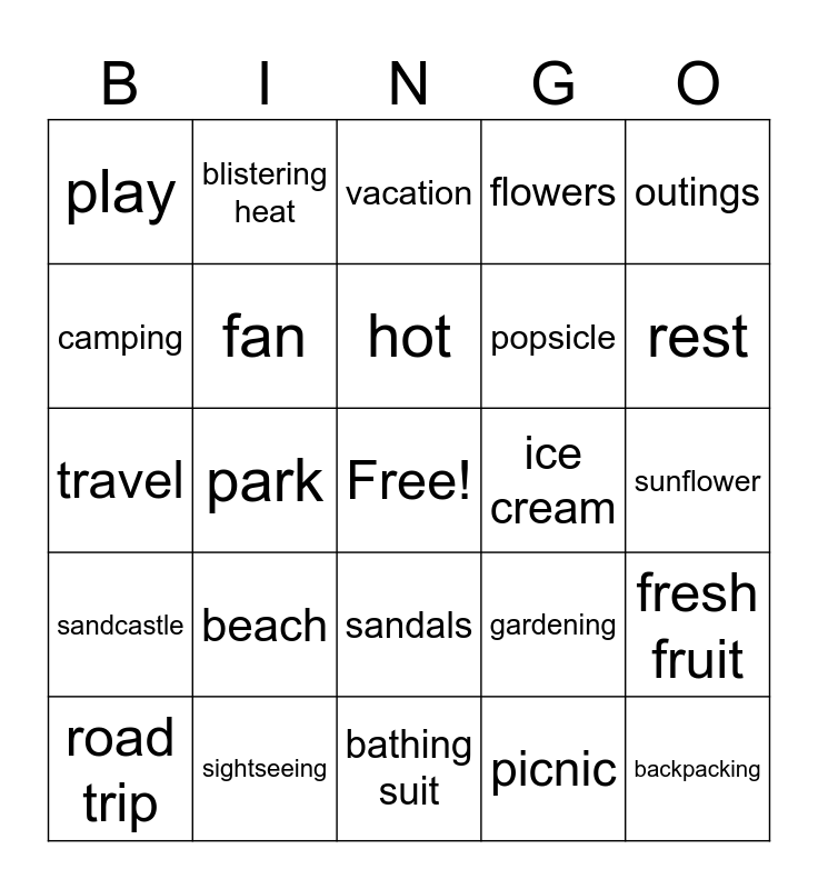 This bingo card has a free space and 49 words: air conditioner, backpacking, baseball, bathing suit, beach, bikini, blistering heat, boating, camping, diving, fan, flowers, fresh fruit, gardening, grass, hiking, hot, ice cream, outdoors, outings, park, picnic, play, popsicle, relax, rest, road trip, sailing, sandals, sandcastle, sea, seashore, shorts, showers, sightseeing, summer, sun, sundress, sunflower, sunhat, sunscreen, swim, swimsuit, tan, travel, vacation, visit, warm weather and waterpark.