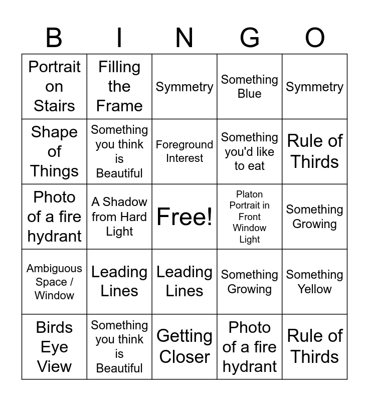 This bingo card has a free space and 48 words: Creative photo of a Cross, Rule of Thirds, Birds Eye View, Getting Closer, Leading Lines, Ambiguous Space / Window, Filling the Frame, Portrait of someone laughing, Shape of Things, Worms Eye View, Something you think is Beautiful, Something Blue, Something Yellow, Something Growing, Reducing it Down, FREE, Foreground Interest, Platon Portrait in Front Window Light, Framing, Symmetry, A Shadow from Hard Light, Photo of a fire hydrant, Portrait on Stairs, Something you'd like to eat, Creative photo of a Cross, Rule of Thirds, Birds Eye View, Getting Closer, Leading Lines, Ambiguous Space / Window, Filling the Frame, Portrait of someone laughing, Shape of Things, Worms Eye View, Something you think is Beautiful, Something Blue, Something Yellow, Something Growing, Reducing it Down, Foreground Interest, Platon Portrait in Front Window Light, Framing, Symmetry, A Shadow from Hard Light, Photo of a fire hydrant, Portrait on Stairs, Something you'd like to eat and Landscape/Nature.
