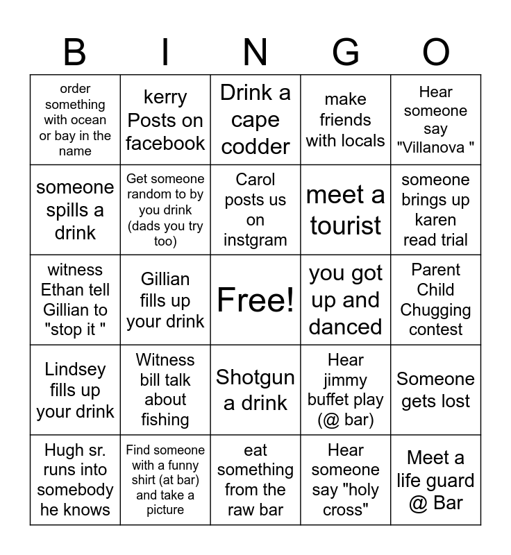 This bingo card has a free space and 32 words: Hear someone say "holy cross", drink a mudslide, Gillian fills up your drink, shot ski!!!, Lindsey fills up your drink, Get someone random to by you drink (dads you try too), Hear someone say "Villanova ", Someone gets lost, kerry Posts on facebook, witness Bill Bagshaw starts to sing, Carol posts us on instgram, Drink a cape codder, witness Hugh Senior tells a hockey story, Drink a mimosa, you got up and danced, witness Lisa bags dance on an elevated surface, Hugh sr. runs into somebody he knows, witness Ethan tell Gillian to "stop it ", Shotgun a drink, Witness bill talk about fishing, Hear jimmy buffet play (@ bar), Hannah makes you take a picture, Parent Child Chugging contest, Find someone with a funny shirt (at bar) and take a picture, Meet a life guard @ Bar, make friends with locals, meet a tourist, someone spills a drink, order something with ocean or bay in the name, eat something from the raw bar, Don runs into someone he knows and someone brings up karen read trial.