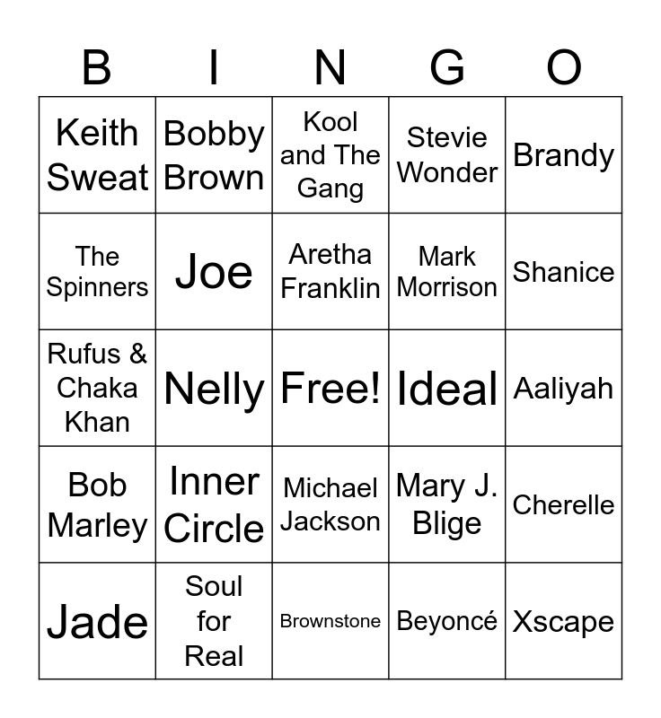 This bingo card has a free space and 30 words: Soul for Real, Fabolous, Nelly, Nivea, Keith Sweat, Kool and The Gang, Joe, Michael Jackson, Ideal, Brownstone, Aaliyah, Xscape, Beyoncé, Zhane, Shanice, Jaheim, Mary J. Blige, Bob Marley, Inner Circle, Brandy, Rufus & Chaka Khan, New Edition, Bobby Brown, Mark Morrison, The Spinners, Stevie Wonder, Cherelle, Jade, Aretha Franklin and Machel Montano.
