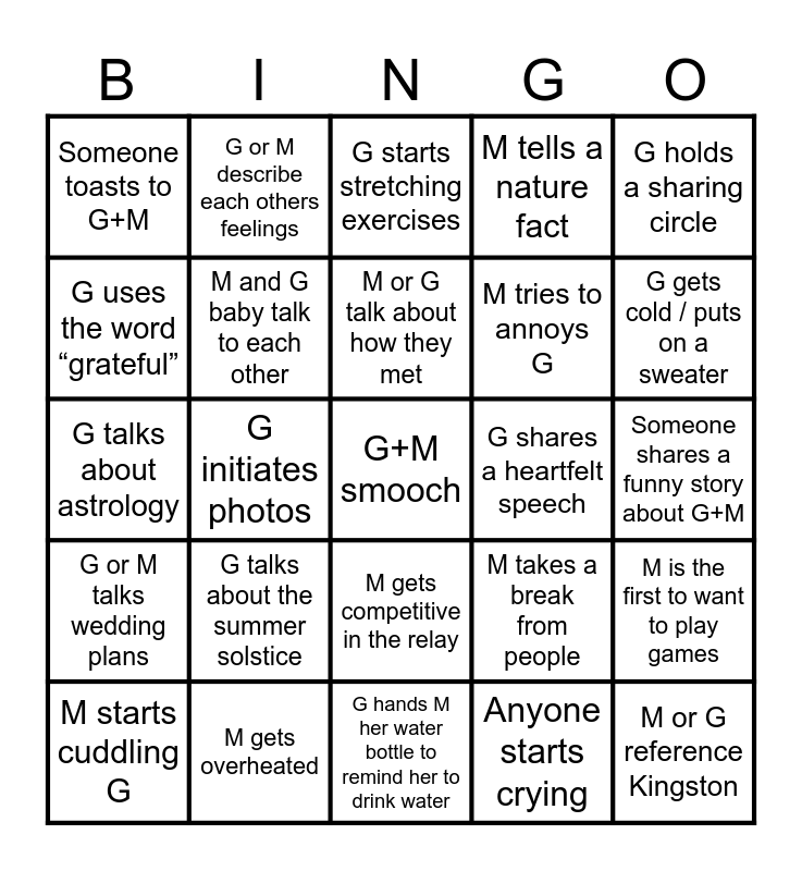 This bingo card has a free space and 24 words: G talks about the summer solstice, M gets overheated, M or G talk about how they met, M starts cuddling G, G holds a sharing circle, Someone toasts to G+M, G uses the word “grateful”, G or M describe each others feelings, G shares a heartfelt speech, M gets competitive in the relay, M tries to annoys G, G talks about astrology, M takes a break from people, M is the first to want to play games, M and G baby talk to each other, Anyone starts crying, Someone shares a funny story about G+M, G starts stretching exercises, G gets cold / puts on a sweater, G initiates photos, M or G reference Kingston, G or M talks wedding plans, M tells a nature fact and G hands M her water bottle to remind her to drink water.