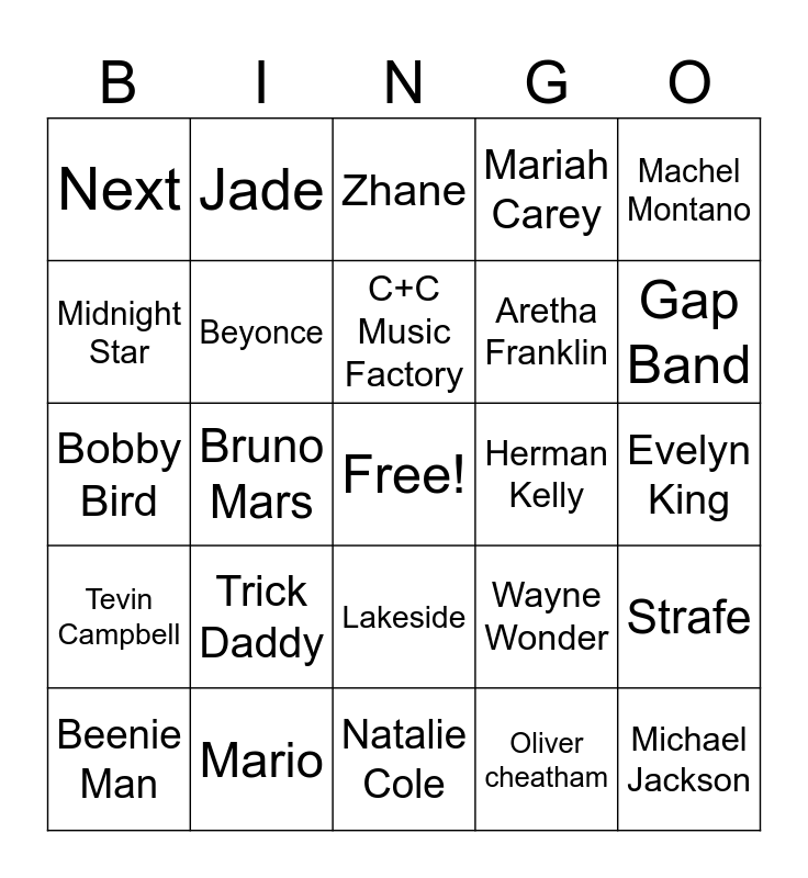 This bingo card has a free space and 30 words: Mario, Keith Sweat, Bruno Mars, Aaliyah, Next, Zhane, Beyonce, Lakeside, Herman Kelly, Natalie Cole, Evelyn King, Michael Jackson, Oliver cheatham, Temptations, Gap Band, Spinners, Wayne Wonder, Tevin Campbell, Trick Daddy, Machel Montano, Bobby Bird, The Whispers, Jade, Aretha Franklin, Midnight Star, Mariah Carey, Strafe, Beenie Man, C+C Music Factory and Estelle.