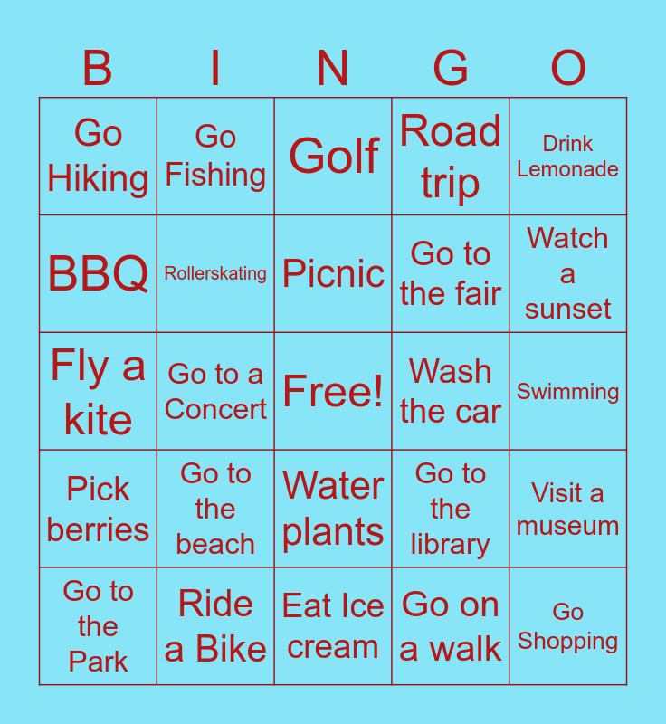 This bingo card has a free space and 24 words: Go to the beach, Ride a Bike, Picnic, Go to the Park, Drink Lemonade, Go Hiking, BBQ, Go Fishing, Wash the car, Water plants, Go to the fair, Fly a kite, Go to the library, Visit a museum, Rollerskating, Go on a walk, Swimming, Golf, Watch a sunset, Go to a Concert, Go Shopping, Pick berries, Road trip and Eat Ice cream.