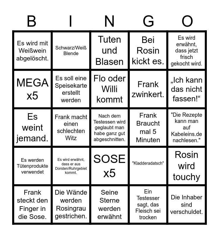 This bingo card has 25 words: Es wird erwähnt, dass er aus Dorsten/Ruhrgebiet kommt., Seine Sterne werden erwähnt, Flo oder Willi kommt, Frank steckt den Finger in die Sose., Es wird erwähnt, dass jetzt frisch gekocht wird., Es wird mit Weißwein abgelöscht., MEGA x5, Schwarz/Weiß Blende, Frank Braucht mal 5 Minuten, SOSE x5, Frank zwinkert., Es weint jemand., "Kladderadatsch", Rosin wird touchy, Es soll eine Speisekarte erstellt werden, Die Inhaber sind verschuldet., "Die Rezepte kann man auf Kabeleins.de nachlesen.", Tuten und Blasen, „Ich kann das nicht fassen!“, Frank macht einen schlechten Witz, Nach dem Testessen wird geglaubt man habe ganz gut abgeschnitten., Die Wände werden Rosingrau gestrichen., Es werden Tütenprodukte verwendet, Bei Rosin kickt es. and Ein Testesser sagt, das Fleisch sei trocken.