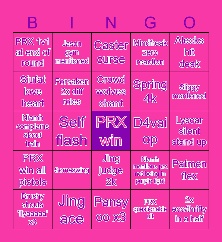 This bingo card has a free space and 24 words: Someswing, Jing ace, Crowd wolves chant, Brushy shouts 'Ilyaaaaa' x3, Alecks hit desk, PRX 1v1 at end of round, Siufat love heart, Jason gym mentioned, D4vai op, Jing judge 2k, Spring 4k, Niamh complains about train, Niamh mentions prx not being in purple light, Patmen flex, Forsaken 2x diff roles, PRX questionable ult, Lysoar silent stand up, Caster curse, Sliggy mentioned, Self flash, 2x eco/thrifty in a half, PRX win all pistols, Mindfreak zero reaction and Pansy oo x3.
