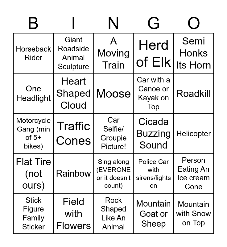 This bingo card has a free space and 34 words: Bug Crawling On The Car, Mountain Goat or Sheep, Waving at Someone In Another Car and they Wave Back, Bald Eagle or Hawk in Flight, Flat Tire (not ours), Heart Shaped Cloud, Semi Honks Its Horn, Stick Figure Family Sticker, Giant Roadside Animal Sculpture, Street Art/Mural, Moose, A Moving Train, Cactus, Hiker with Trekking Poles, Cicada Buzzing Sound, Roadkill, Field with Flowers, Motorcycle Gang (min of 5+ bikes), Rainbow, Police Car with sirens/lights on, Sing along (EVERONE or it doesn't count), Rocks Stacked In A Pile, Horseback Rider, Helicopter, Rock Shaped Like An Animal, Mountain with Snow on Top, Herd of Elk, Rain and Sun at the Same Time, Car with a Canoe or Kayak on Top, One Headlight, Prairie Dog, Traffic Cones, Person Eating An Ice cream Cone and Side by Side, UTV, or ATV.