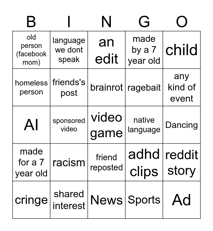 This bingo card has a free space and 24 words: racism, shared interest, brainrot, cringe, child, old person (facebook mom), homeless person, language we dont speak, native language, friend reposted, ragebait, AI, adhd clips, reddit story, friends's post, Sports, Dancing, an edit, any kind of event, sponsored video, Ad, made for a 7 year old, made by a 7 year old and News.