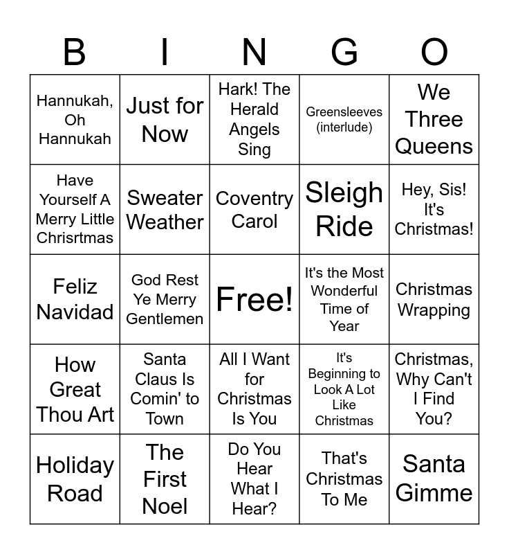 This bingo card has a free space and 89 words: 12 Days of Christmas, Adeste fidelis, All I Want for Christmas Is You, Angels We Have Heard on High, Away in a Manger, Baby It's Cold Outside, Blue Christmas, Born on Christmas Day, Carol fo the Bells, Christmas Eve, Christmas Eve With You, The Christmas Song (Chestnuts), Christmas, Why Can't I Find You?, Christmas Wrapping, Coldest Winter, Coventry Carol, Dance of the Sugar Plum Fairy, Deck the Halls, Deck the Rooftop, DJ Play a Christmas Song, Donde Esta Santa Claus?, Do They Know It's Christmas, Do You Hear What I Hear?, Extraordinary Merry Christmas, Feliz Navidad, The First Noel, God Rest Ye Merry Gentlemen, Good to Be Bad, Go Tell it On the Mountain, Green Christmas, Greensleeves (interlude), God Rest Ye Merry Gentlemen, Hallelujah, Hannukah, Oh Hannukah, Happy Xmas (War Is Over), Hark! The Herald Angels Sing, Have Yourself A Merry Little Chrisrtmas, Here Comes Santa Claus, Hey, Sis! It's Christmas!, Holiday Road, How Great Thou Art, I'll Be Home For Christmas, I'm Getting Nuttin' For Christmas, I Saw Three Ships, It's Beginning to Look A Lot Like Christmas, It's the Most Wonderful Time of Year, Jingle Bell Rock, Jingle Bells, Joy to the World, Just for Now, Last Christmas, Let It Go, Let It Snow, Little Drummer Boy, Love Child, Making Christmas, Mary, Did You Know!, Mary's Boy Child, Merry Christmas, Darly, Merry Christmas, Happy Holidays, My Favorite Things, O Christmas Tree, O Come All Ye Faithful, O Come, O Come Emmanuel, O Holy Night, Peppermint Winter, River, Rockin' Around the Chrimstas Tree, Santa Baby, Santa Claus Is Comin' to Town, Santa Gimme, Show Me That You Festive, Silent Night, Sleigh Ride, Sweater Weather, That's Christmas To Me, This Christmas, Up On the Housetop, Waltz of the Flowers, We Need A Little Christmas, We Three Queens, What Christmas Means to Me, When You Believe, Where Are You Christmas?, White Christmas, White Winter Hymnal, Winter Wonderland/Don't Worry, Be Happy, Wonderful Christmastime and You're A Mean One Mr. Grinch.
