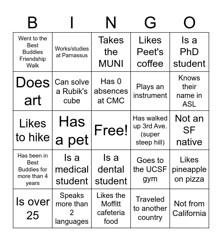 This bingo card has a free space and 24 words: Is a medical student, Speaks more than 2 languages, Has 0 absences at CMC, Is over 25, Is a PhD student, Went to the Best Buddies Friendship Walk, Does art, Works/studies at Parnassus, Has walked up 3rd Ave. (super steep hill), Is a dental student, Plays an instrument, Likes to hike, Goes to the UCSF gym, Likes pineapple on pizza, Can solve a Rubik's cube, Traveled to another country, Not an SF native, Takes the MUNI, Knows their name in ASL, Has a pet, Not from California, Has been in Best Buddies for more than 4 years, Likes Peet's coffee and Likes the Moffitt cafeteria food.