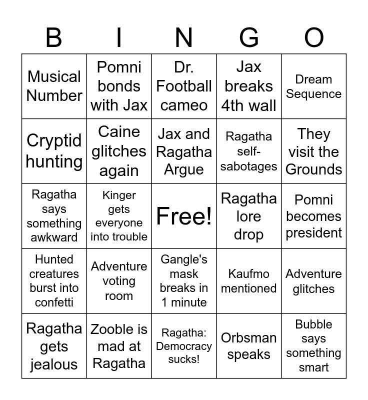 This bingo card has a free space and 24 words: Ragatha gets jealous, Adventure voting room, Jax and Ragatha Argue, Orbsman speaks, Dream Sequence, Musical Number, Pomni bonds with Jax, Dr. Football cameo, Ragatha lore drop, Pomni becomes president, Ragatha says something awkward, Caine glitches again, Kaufmo mentioned, Adventure glitches, Cryptid hunting, Zooble is mad at Ragatha, Ragatha: Democracy sucks!, Jax breaks 4th wall, They visit the Grounds, Hunted creatures burst into confetti, Kinger gets everyone into trouble, Gangle's mask breaks in 1 minute, Ragatha self-sabotages and Bubble says something smart.