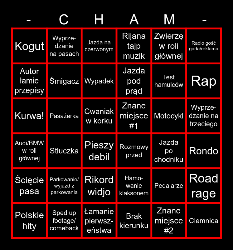 This bingo card has 36 words: Hamo- wanie klaksonem, Rikord widjo, Brak kierunku, Autor łamie przepisy, Audi/BMW w roli głównej, Znane miejsce #1, Śmigacz, Łamanie pierwsz-eństwa, Zwierzę w roli głównej, Pedalarze, Rap, Rijana tajp muzik, Road rage, Pasażerka, Jazda pod prąd, Kogut, Ścięcie pasa, Motocykl, Kurwa!, Jazda na czerwonym, Cwaniak w korku, Stłuczka, Rozmowy przed, Pieszy debil, Jazda po chodniku, Wyprze-dzanie na pasach, Test hamulców, Sped up footage/ comeback, Wypadek, Radio gość gada/reklama, Ciemnica, Polskie hity, Rondo, Wyprze-dzanie na trzeciego, Parkowanie/ wyjazd z parkowania and Znane miejsce #2.