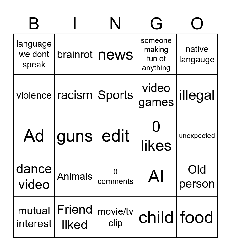 This bingo card has a free space and 24 words: Animals, Friend liked, Sports, mutual interest, native langauge, language we dont speak, violence, brainrot, 0 likes, 0 comments, video games, Ad, AI, Old person, racism, child, unexpected, news, illegal, guns, food, dance video, someone making fun of anything and movie/tv clip.