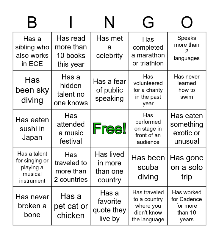 This bingo card has a free space and 24 words: Has traveled to more than 2 countries, Has a pet cat or chicken, Has a fear of public speaking, Has never broken a bone, Speaks more than 2 languages, Has a sibling who also works in ECE, Has been sky diving, Has read more than 10 books this year, Has performed on stage in front of an audience, Has lived in more than one country, Has volunteered for a charity in the past year, Has eaten sushi in Japan, Has been scuba diving, Has gone on a solo trip, Has a hidden talent no one knows, Has traveled to a country where you didn't know the language, Has eaten something exotic or unusual, Has met a celebrity, Has never learned how to swim, Has attended a music festival, Has worked for Cadence for more than 10 years, Has a talent for singing or playing a musical instrument, Has completed a marathon or triathlon and Has a favorite quote they live by.