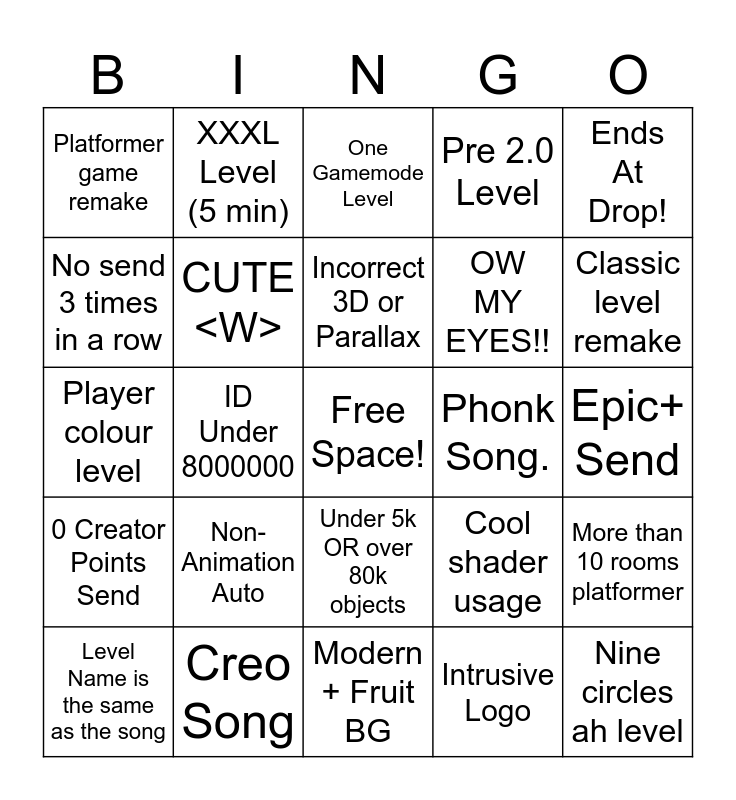 This bingo card has a free space and 24 words: Non-Animation Auto, Creo Song, Incorrect 3D or Parallax, Level Name is the same as the song, Ends At Drop!, Platformer game remake, No send 3 times in a row, XXXL Level (5 min), Phonk Song., Under 5k OR over 80k objects, OW MY EYES!!, Player colour level, Cool shader usage, More than 10 rooms platformer, CUTE <W>, Intrusive Logo, Epic+ Send, One Gamemode Level, Classic level remake, ID Under 8000000, Nine circles ah level, 0 Creator Points Send, Pre 2.0 Level and Modern + Fruit BG.