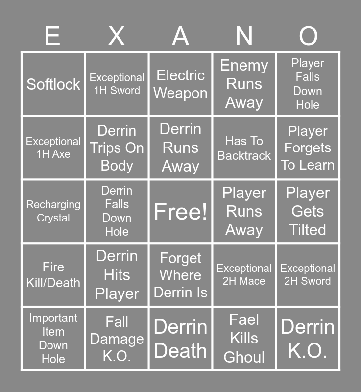 This bingo card has a free space and 46 words: Player K.O., Derrin K.O., Player Death, Derrin Death, Derrin Hits Player, Player Hits Derrin, Exceptional 1H Sword, Exceptional 1H Mace, Exceptional 1H Axe, Player Trips On Body, Derrin Trips On Body, Enemy Runs Away, Exceptional 2H Sword, Exceptional 2H Mace, Exceptional 2H Axe, Enemy Kills Enemy, Derrin Runs Away, Player Runs Away, Derrin Stances Up On Player, Player Falls Down Hole, Derrin Falls Down Hole, Fael Kills Ghoul, Softlock, Has To Backtrack, Enemy Stuck In Door, Player Forgets To Learn, Important Item Down Hole, Enemy Falls Down Hole, Forget Where Derrin Is, Fire Kill/Death, Player Gets Flung, Poltergeist, Accidental Wrong Thaum, Fael Horn Block, Golem Curb Stomp, Fall Damage K.O., Player Gets Tilted, Player Lands On Feet, Error Appears, Night Vision, Flame Weapon, Electric Weapon, Recharging Crystal, Regen Sharp Weapon, Armor Of Encumbrance and Enemy With Giant Weapon.