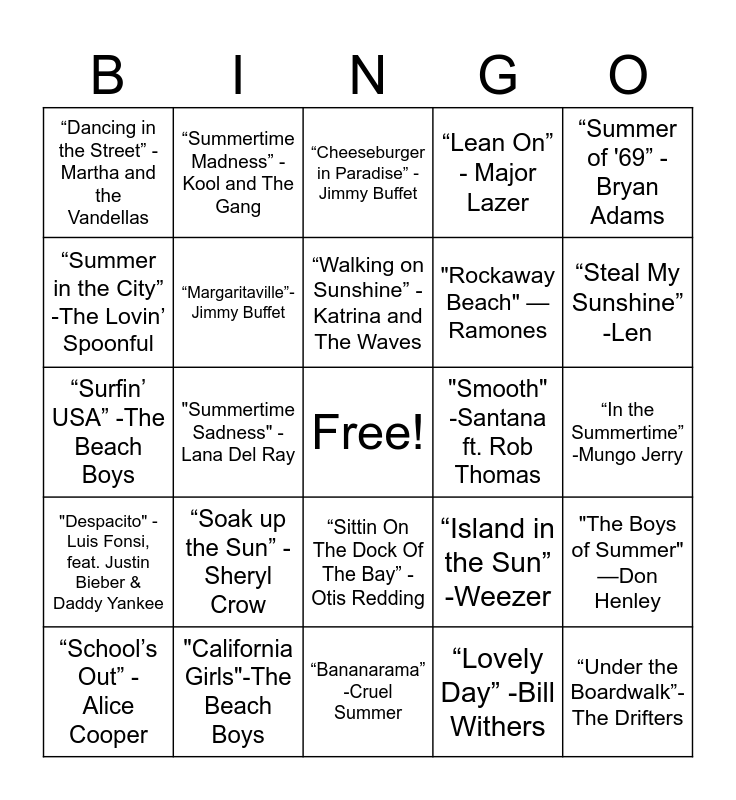 This bingo card has a free space and 42 words: “Here Comes The Sun” -The Beatles, “Walking on Sunshine” -Katrina and The Waves, “Summer Nights”- Olivia Newton John & John Travolta, “Soak up the Sun” -Sheryl Crow, “Lovely Day” -Bill Withers, "The Boys of Summer" —Don Henley, “Under the Boardwalk”-The Drifters, “Jump In The Line” -Harry Belafonte, “Cheeseburger in Paradise” -Jimmy Buffet, “Sittin On The Dock Of The Bay” -Otis Redding, “In the Summertime” -Mungo Jerry, “Steal My Sunshine” -Len, "Summertime Sadness" -Lana Del Ray, “Summer of '69” -Bryan Adams, “Summer Nights” -Van Halen, “Island in the Sun” -Weezer, “Good Day Sunshine” -The Beatles, “Surfin’ USA” -The Beach Boys, “In The Sun”-Blondie, “Summertime Madness” -Kool and The Gang, “Summer in the City” -The Lovin’ Spoonful, “It’s Summer” -Gladys Knight & the Pips, “Cruel Summer”’ -Taylor Swift, “Dancing in the Street” -Martha and the Vandellas, “Good Vibrations” -The Beach Boys, "Beyond the Sea" —Bobby Darin, "Rockaway Beach" —Ramones, “The Girl from Ipanema” -Antonio Carlos Jobim, “Waves” - Miguel ft. Tame Impala, “Rock Lobster” - The B-52s, "Summer In the City" -The Lovin’ Spoonful, "Despacito" -Luis Fonsi, feat. Justin Bieber & Daddy Yankee, “Margaritaville”- Jimmy Buffet, “Bananarama” -Cruel Summer, “Vacation” -The Go-Gos,, “School’s Out” -Alice Cooper, "California Girls"-The Beach Boys, "Smooth" -Santana ft. Rob Thomas, “Someday” - Sugar Ray, “Sweet Escape”-Gwen Stefani, “Lean On” - Major Lazer and "Pulling Mussels (From the Shell)" -Squeeze.