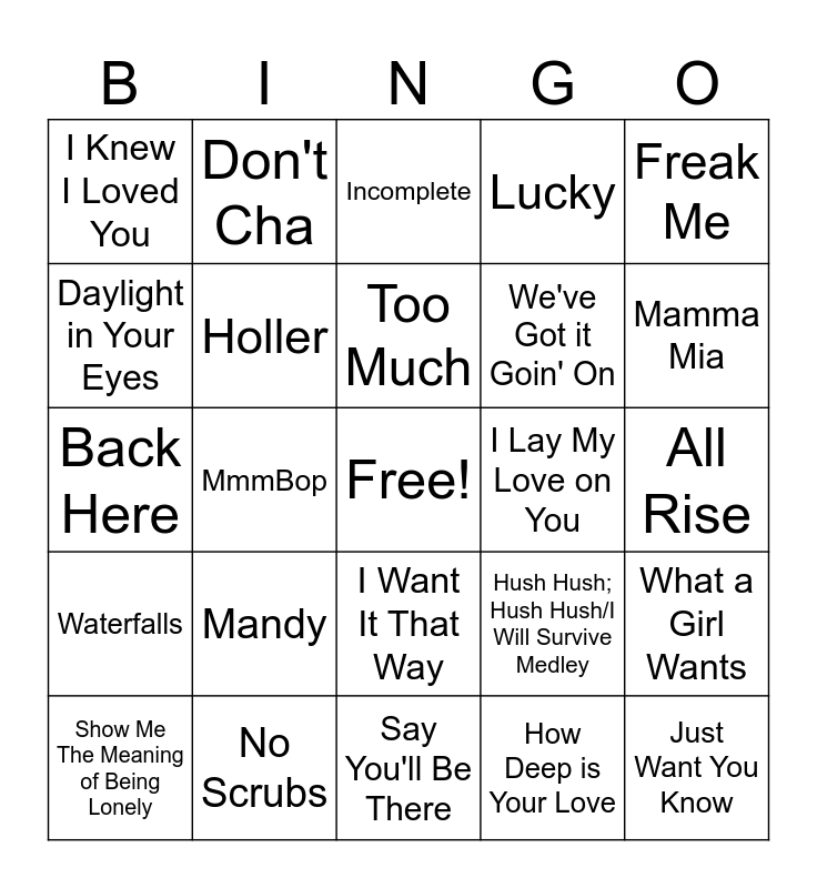 This bingo card has a free space and 111 words: This I Promise You, Pop, Tearin' Up My Heart, Sailing, Everything I Own, I Want You Back, Bye Bye Bye, It's Gonna Be Me, Girlfriend, Gone, My Love, If I Let You Go, When You Say Nothing At All, No Matter What, World of Our Own, Uptown Girl, I Want It That Way, Quit Playing Games (With My Heart), As Long as You Love Me), Larger than Life, Show Me The Meaning of Being Lonely, Incomplete, Shape of My Heart, Life is A Rollercoaster, I Turn to You, Waterfalls, No Scrubs, Emotion, 2 Become 1, Wanna Be, I Knew I Loved You, MmmBop, Truly Madly Deeply, Sometimes, We Will Rock You, Don't Wanna Let You Go, Keep on Movin', Everybody (Backstreet's Back), The One, All I Have to Give, Everybody Get Up, When the Lights Go Out, Spice Up Your Life, Stop, Too Much, Viva Forever, Say You'll Be There, Holler, Goodbye, I Want You, I Know Where It's At, Pure Shoes, What Took You So Long, Whenever You're Near Me, Fool Again, Keep on Movin', Daylight in Your Eyes, The Call, Picture of You, If Ya Gettin' Down, Back for Good, Drowning, I Swear, All Rise, Get Down (You're the One for Me), We've Got it Goin' On, Step by Step, Let's Dance, Upside Down, Holler, Mamma Mia, World of Our Own, Eternal Flame, Get Another Boyfriend, Overprotected, Come On Over Baby (All I Want Is You), Slam Dunk (Da Funk), Genie in a Bottle, As Long as You Love Me, Mandy, The Tide is High, How Deep is Your Love, I Lay My Love on You, What a Girl Wants, More than That, I Will Come to You, Lucky, (You Drive Me) Crazy, Just Want You Know, Where's the Love, Freak Me, Sound of the Underground, Until the Time is Through, I'm Not A Girl, Not Yet a Woman, Angel of Mine, Super Trouper, Back Here, Gotta Tell You, That's What Love Can Do, My Love, I Want You to Want Me, Under the Bridge, More than That, Stickwitu, Hush Hush; Hush Hush/I Will Survive Medley, Don't Cha, I Hate This Part, Buttons, If I Let You Go, All Rise and World of Our Own.