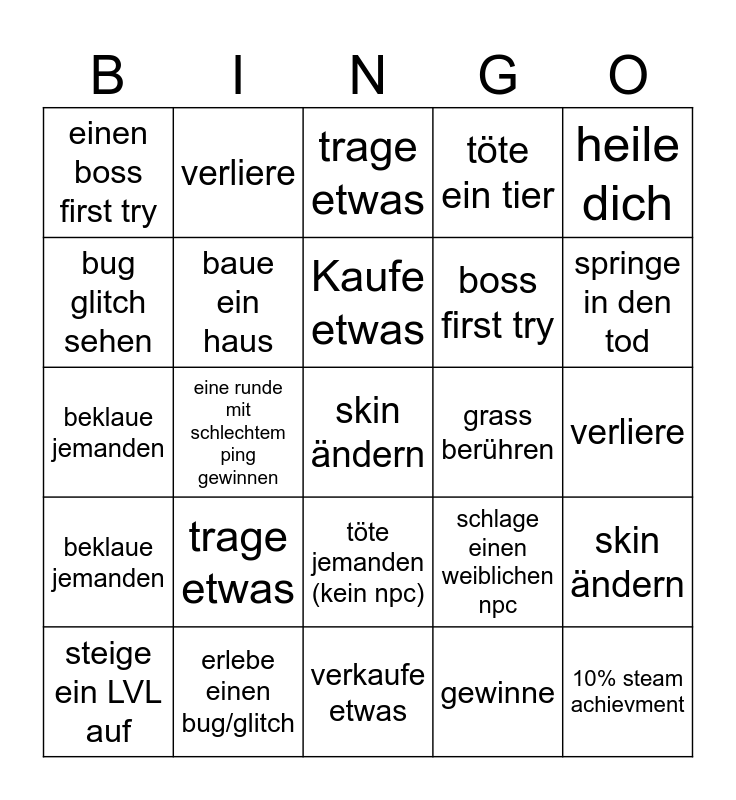 This bingo card has 31 words: steige ein LVL auf, bekomme 1K von etwas, Kaufe etwas, gewinne, heile dich, einen boss first try, baue ein haus, töte jemanden (kein npc), boss first try, ein spiel durchspielen, beklaue jemanden, eine runde mit schlechtem ping gewinnen, finde etwas seltenes, schlage einen weiblichen npc, verliere, verkaufe etwas, trage etwas, skin ändern, grass berühren, 10% steam achievment, bug glitch sehen, erhalte ein steam achievment, verkaufe etwas, töte ein tier, springe in den tod, verliere, trage etwas, skin ändern, erlebe einen bug/glitch, beklaue jemanden and verkaufe etwas.