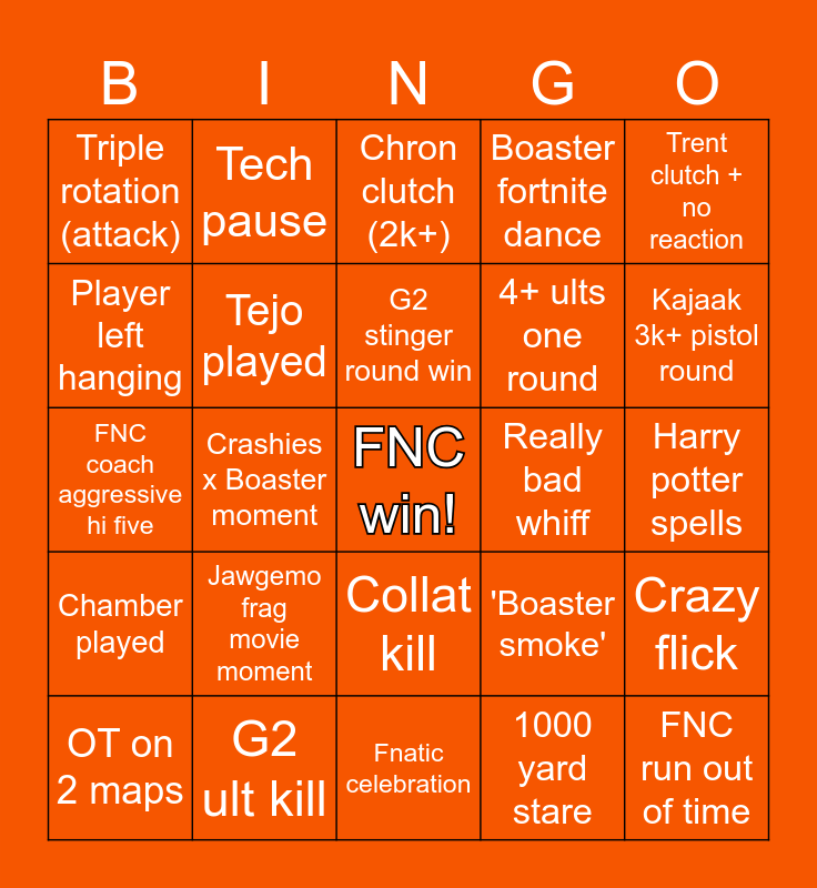 This bingo card has a free space and 24 words: Jawgemo frag movie moment, G2 ult kill, G2 stinger round win, OT on 2 maps, Trent clutch + no reaction, Triple rotation (attack), Player left hanging, Tech pause, Really bad whiff, Collat kill, 4+ ults one round, FNC coach aggressive hi five, 'Boaster smoke', Crazy flick, Tejo played, 1000 yard stare, Harry potter spells, Chron clutch (2k+), Kajaak 3k+ pistol round, Crashies x Boaster moment, FNC run out of time, Chamber played, Boaster fortnite dance and Fnatic celebration.