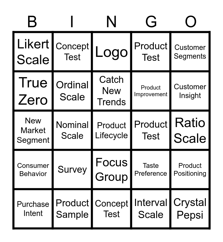 This bingo card has a free space and 24 words: Survey, Product Sample, Catch New Trends, Purchase Intent, Customer Segments, Likert Scale, True Zero, Concept Test, Product Test, Focus Group, Product Improvement, New Market Segment, Taste Preference, Product Positioning, Ordinal Scale, Interval Scale, Ratio Scale, Logo, Customer Insight, Nominal Scale, Crystal Pepsi, Consumer Behavior, Product Test and Concept Test.