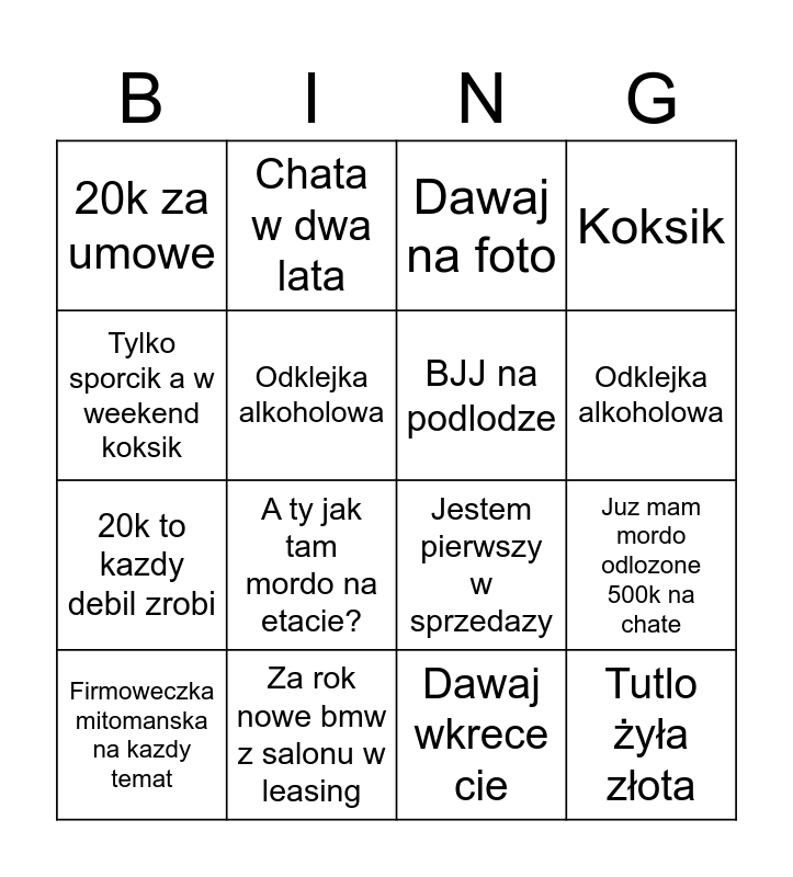 This bingo card has 19 words: Jestem pierwszy w sprzedazy, Tylko o hajsie gadka, Dawaj na foto, Tutlo żyła złota, Juz mam mordo odlozone 500k na chate, Tylko sporcik a w weekend koksik, Dawaj wkrece cie, 20k za umowe, Chata w dwa lata, 20k to kazdy debil zrobi, A ty jak tam mordo na etacie?, Odklejka alkoholowa, BJJ na podlodze, Za rok nowe bmw z salonu w leasing, Firmoweczka mitomanska na kazdy temat, Solo sztuka koksu w jeden wieczor, Koksik, Odklejka alkoholowa and Tylko o hajsie gadka.