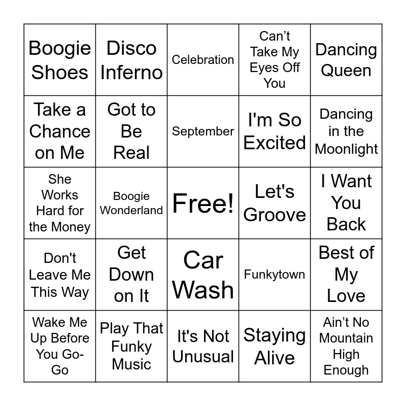This bingo card has a free space and 32 words: Staying Alive, Le Freak, Boogie Wonderland, I Will Survive, Don't Leave Me This Way, Got to Be Real, Dancing Queen, Best of My Love, Disco Inferno, That's the Way I Like It, September, Celebration, We Are Family, More Than a Woman, Let's Groove, Footloose, Wake Me Up Before You Go-Go, She Works Hard for the Money, Car Wash, Get Down on It, Funkytown, YMCA, I Want You Back, Play That Funky Music, Ain’t No Mountain High Enough, Can’t Take My Eyes Off You, I'm So Excited, Take a Chance on Me, Boogie Shoes, It's Not Unusual, Come and Get Your Love and Dancing in the Moonlight.