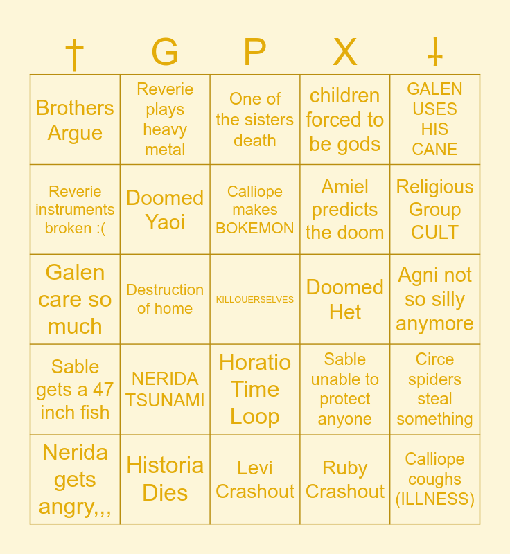 This bingo card has a free space and 30 words: Historia Dies, Gods in our heads, Destruction of home, Rift Rerun, Brothers Argue, One of the sisters death, Doomed Yaoi, Horatio Time Loop, Doomed Het, Levi Crashout, Agni not so silly anymore, Calliope coughs (ILLNESS), Ruby Crashout, One of the brothers death, Religious Group CULT, Cassius Clutch (LUCK), Sable unable to protect anyone, Sable gets a 47 inch fish, NERIDA TSUNAMI, GALEN USES HIS CANE, Galen care so much, YVETTE RETURN, Reverie plays heavy metal, Amiel predicts the doom, Reverie instruments broken :(, children forced to be gods, Circe spiders steal something, Nerida gets angry,,,, Calliope makes BOKEMON and RUBY ACCIDENTALLY DRUGSD EVERYONE.