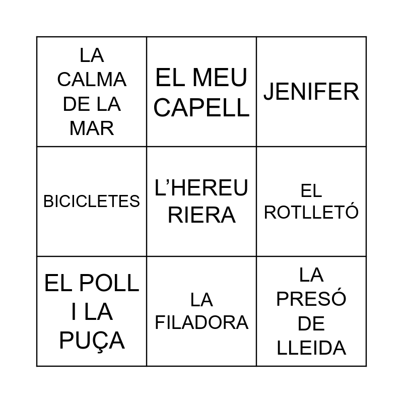 This bingo card has 53 words: CANÇÓ DELS OFICIS, PLOREU NINETES, EL BALL DE LA CIVADA, CANÇÓ DE LES MENTIDES, BALL DE ST. FERRIOL, LA PASTORETA, EL MEU CAPELL, MARGARIDETA, EL ROTLLETÓ, UNA MATINADA FRESCA, EL POLL I LA PUÇA, EL BON CAÇADOR, EL MARIDET, ELS TRES TAMBORS, EN PERE GALLERÍ, LA GATA I EL BELITRE, LA FILADORA, EL ROSSINYOL, MUNTANYA DEL CANIGÓ, L’HEREU RIERA, MARIETA CISTELLERA, ELS CONTRABANDISTES, LA PRESÓ DE LLEIDA, LA CALMA DE LA MAR, LA DAMA D’ARAGÓ, BAIXANT DE LA FONT DEL GAT, CANÇÓ DEL LLADRE, CANT DE LA SENYERA, ELS SEGADORS, LLENÇA’T, BOIG PER TU, COM UNA LLUNA A L’AIGUA, CAMINS, CORREN, VULL ESTAR AMB TU, MÚSIC DE CARRER, BICICLETES, ANIVERSARI, JENIFER, AL MAR, LA DANSA DEL VESTIT, FLOR DE PRIMAVERA, COMPTA AMB MI, CAMINEM LLUNY, PA AMB OLI I SAL, QUAN TOT S’ENLAIRA, L’ESTACA, L’EMPORDÀ, LA PETITA RAMBLA DEL POBLE SEC, BON DIA, STAY HOMA, QUAN SOMRIUS and PUFF EL DRAC MÀGIC.