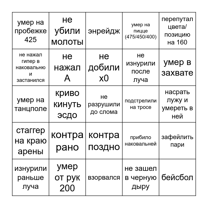 This bingo card has a free space and 24 words: контра рано, умер от рук 200, не добили х0, изнурили раньше луча, перепутал цвета/позицию на 160, умер на пробежке 425, не нажал гипер в наковальню и застанился, не убили молоты, подстрелили на тросе, контра поздно, не изнурили после луча, умер на танцполе, прибило наковальней, зафейлить пари, не нажал А, не зашел в черную дыру, насрать лужу и умереть в ней, энрейдж, умер в захвате, криво кинуть эсдо, бейсбол, стаггер на краю арены, умер на пицце (475/450/400) and взорвался.