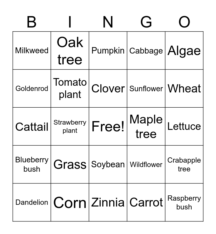 This bingo card has a free space and 24 words: Grass, Corn, Clover, Dandelion, Algae, Milkweed, Goldenrod, Oak tree, Maple tree, Soybean, Sunflower, Cattail, Wildflower, Crabapple tree, Tomato plant, Carrot, Lettuce, Pumpkin, Wheat, Strawberry plant, Raspberry bush, Blueberry bush, Cabbage and Zinnia.