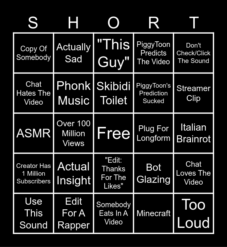 This bingo card has a free space and 33 words: Freeboot, AI Voice, Over 100 Million Views, Video Uploaded Today, Creator Has 1 Million Subscribers, Phonk Music, Don't Check/Click The Sound, Use This Sound, Actually Sad, Mr Beast, Skibidi Toilet, "This Guy", "Massive", Trend, Plug For Longform, Streamer Clip, Edit For A Rapper, ASMR, Actual Insight, Bot Glazing, "Edit: Thanks For The Likes", Drama, Copy Of Somebody, Italian Brainrot, Somebody Eats In A Video, Too Loud, PiggyToon Predicts The Video, PiggyToon's Prediction Sucked, Chat Hates The Video, Chat Loves The Video, Person Bullies Somebody, Minecraft and Gorilla Tag.
